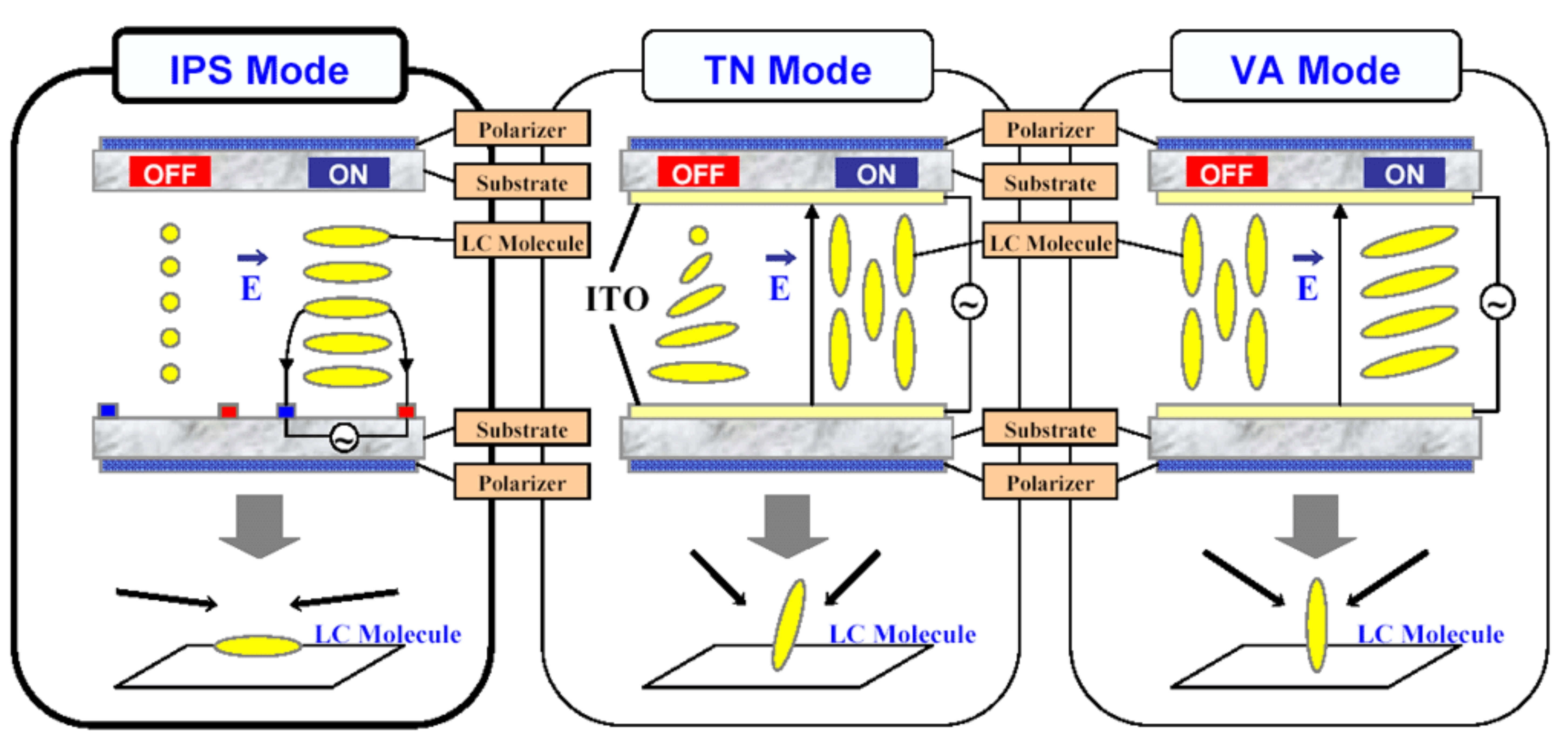 TN-LCD和IPS-LCD的不同在于面板内部的液晶分子的排列方式不同。在传统的液晶排布模式比如扭曲向列(twisted nematic (TN))中,其对应面板存在着随着观测角改变而带来的亮度改变和色彩迁移的问题。这是因为在该模式下,当特定电压施加在面板上时,内部液晶分子取向变为直立的状态,其光学性质随着观测角度的改变而发生变化。另一方面,在面内转换(in-plane switching (IPS))的模式中,液晶分子平行于面板而进行旋转,这就意味着在TN模式下的观测角的问题可以得到解决,因此面板的显示质量可以得到较大的改善。